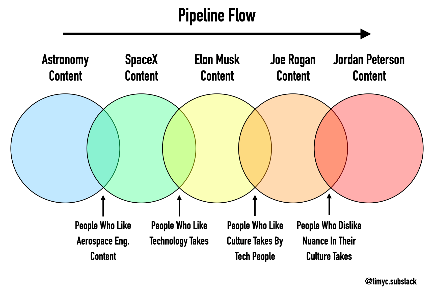 The problem with this model is that people tend to have pretty diverse interests. While we may share interest in one topic, we actually don’t have commonality with others. However, the curation algorithm doesn’t recognize these nuanced differences and still propagates the browsing interests of others to us. This model of algorithmic curation gives rise to “content pipelines”. Content pipelines are the consequence of attempting to segment you with other similar users and show content that those other users interacted with. For example, if you’re interested in video games, curation algorithms may show you video game art, music and news because other accounts have overlapping interests. But your interest in video games also overlaps with the terminally online culture warriors in the gamercel community, so your content may slip into showing you toxic culture slop from this tribe of users.
